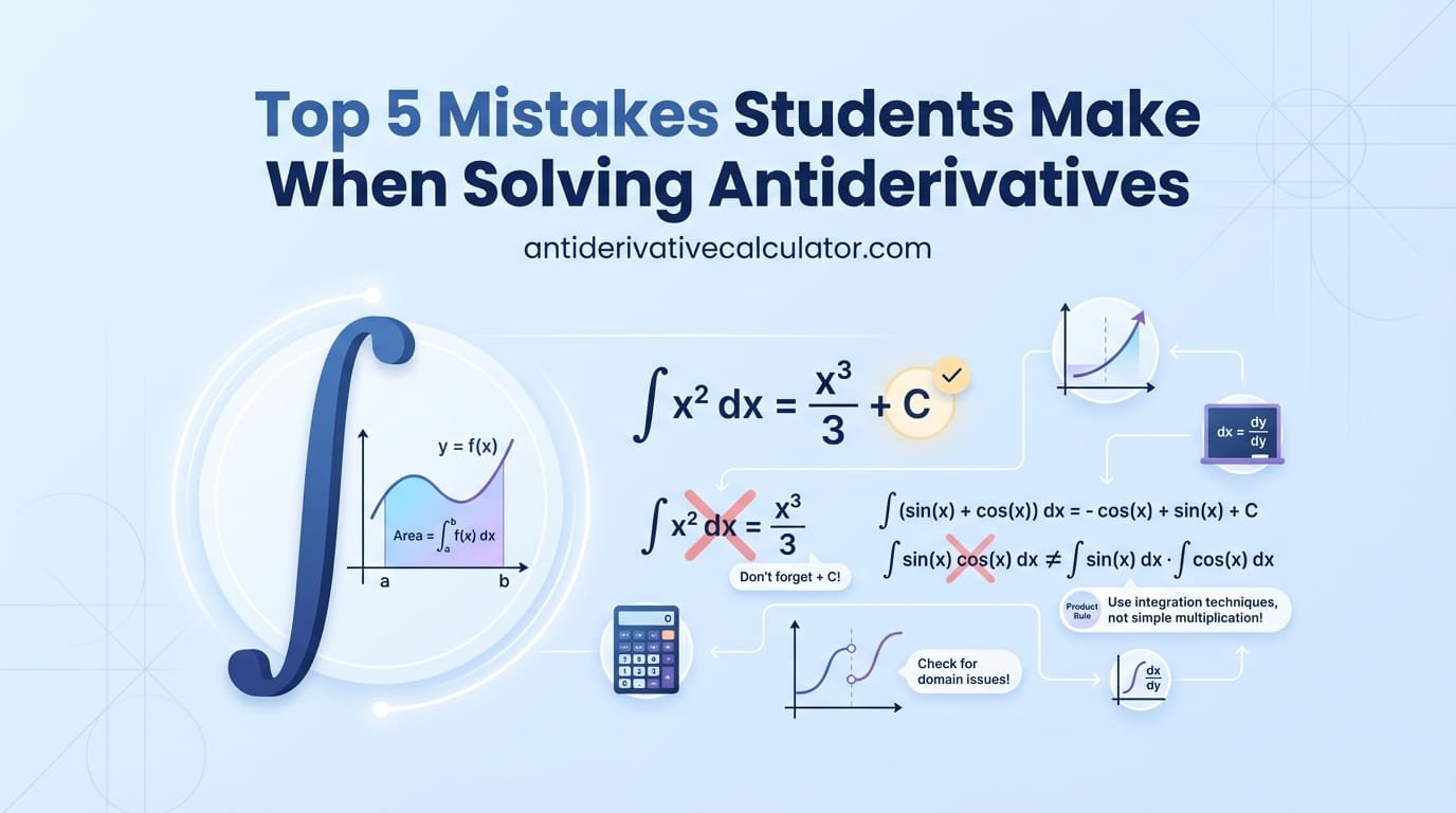 The top five antiderivative mistakes β missing + C, forgetting to divide by the inner coefficient, using the wrong rule for special functions, dropping negative signs in trig antiderivatives, and skipping verification β account for the overwhelming majority of integration errors made by beginner calculus students. Every single one of them is preventable with the right habits: write + C every time, check for inner coefficients every time, identify function types before choosing rules, connect trig rules to their derivative origins, and differentiate every answer before moving on. Use the antiderivative calculator on this site to catch anything you miss and turn every error into a learning opportunity. With these habits in place, your integration accuracy will improve faster than you might expect β and those lost marks will start coming back.